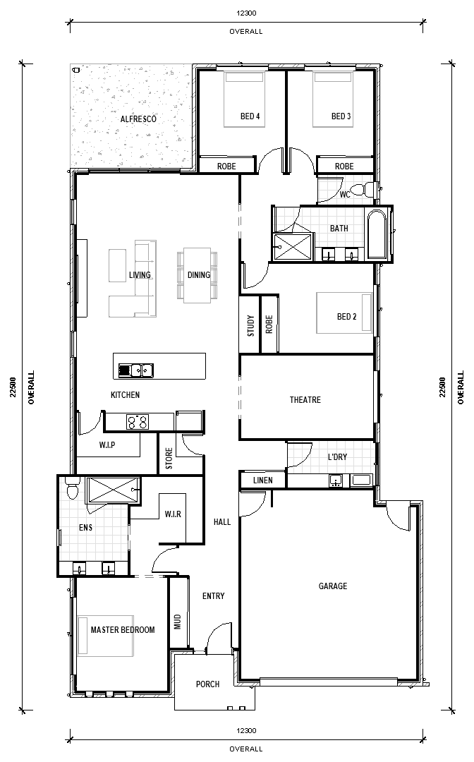 The Ayla is an entertainers dream! The inclusions of a theatre, open kitchen living and dining that leads to an alfresco outdoor area creates the perfect space for family gatherings. This four bedroom, two bathroom, will provide you with all the creature comforts you are after. The Ayla has two facade options; Modern or Skillion style. No matter which facade you select this house plan will be sure to make all your parties a win.